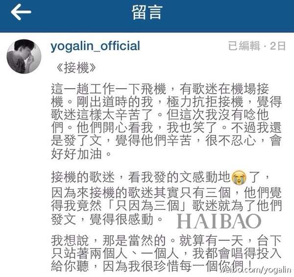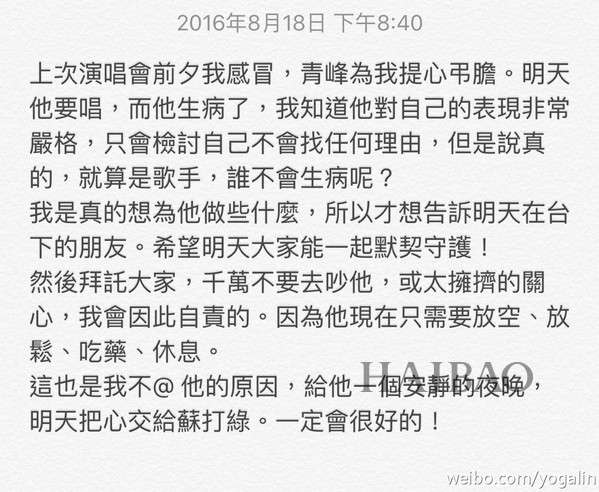 林宥嘉同步在脸书发了这篇长文,
