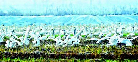 图为:湖北龙感湖国家级自然保护区引来两万多只小天鹅越冬 楚天都市报记者黄士峰摄