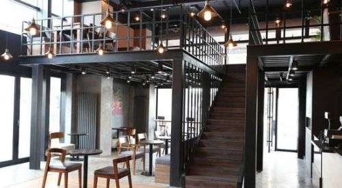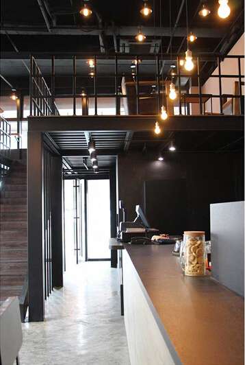 两层的空间,一楼为大型公共区,并向外延伸与露台连接。公共区包含服务区,收银台等。设置了大型的多人木桌,同时,在夹层下方区域,摆放双人咖啡桌椅,明确划分商务区与休闲区,呈现出多样的空间氛围。碳钢楼梯 装修效果图)则将一层与夹层连接,由此进入安静的上层区域。