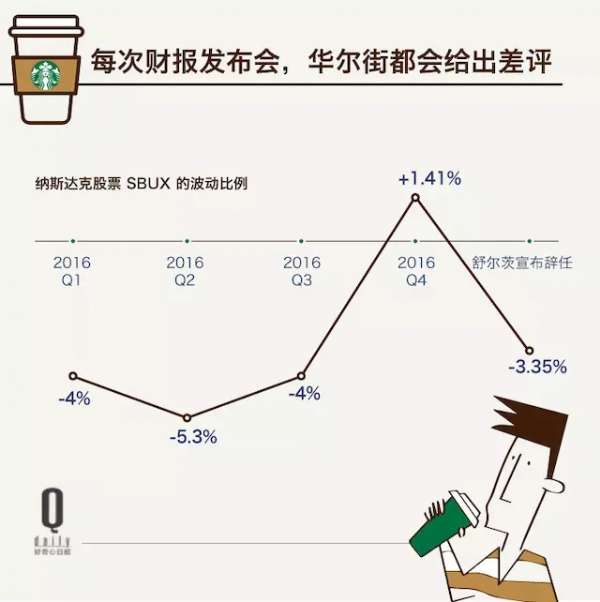 宣布将在 2017 年 4 月 3 日正式卸任星巴克 CEO。即使在随后的发言中高度肯定了继任者、现任 COO 凯文·约翰逊和整个高层管理团队的能力,并且保证自己并不是从此离开星巴克,他还是没能稳定住大家的情绪。资本市场出现了一阵恐慌,星巴克盘后股价下跌 3.35%,蒸发了近 30 亿美元的市值。