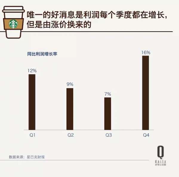 唯一值得欣慰的是利润,凭借第四季度的表现,2016 财年成了它 24 年以来利润率最高的一年,但它更大程度上是靠涨价换来的。今年 7 月,星巴克宣布将把部分饮品涨价 30 美分,这个没有被大部分消费者在意的微弱涨价实则比去年 5-20 美分的涨价有所提升,而对于这个跨国大型公司来说,这已经足够给它带来可观的利润提升了。