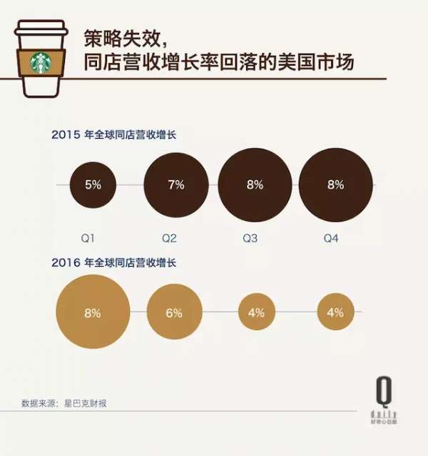 但刘天源这样的用户却是少数。截止到财年结束,真正使用使用 Mobile Order&Pay 的人数只占它全美消费总数的 6%,这项推广了将近 2 年的服务几乎没激起什么水花。另外,曾被寄予厚望的餐食业务也发展不力,比如门店开卖主持人奥普拉最爱的 bagel 了、推出 8 美元的午饭套餐了,部分门店还有 brunch。但即使星巴克后来在和公益组织合作将每天门店内剩余的食物捐出去中制造了一些噱头,并且投资了意大利知名烘焙连锁 Princi,人们还是不怎么为这个咖啡之外的品类买账星巴克。因此,对比去年,2016 财年星巴克在美国的同店营收增长率有着回落的趋势。