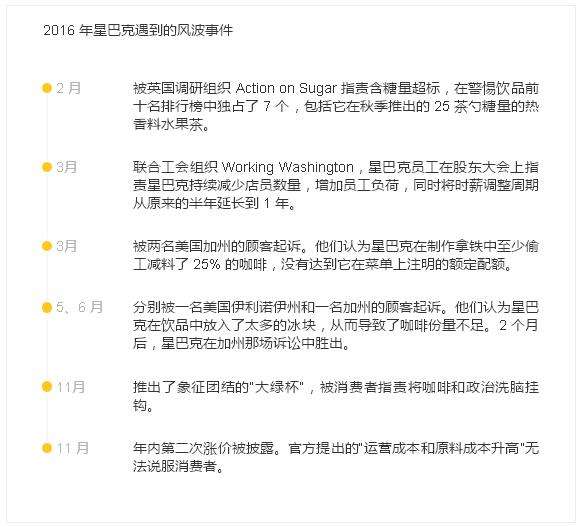 星巴克在这一年中,还遭遇了各种不大不小的风波。它们中的一些虽然是原本就存在的,但突然在一年内集中爆发还是引人深思。