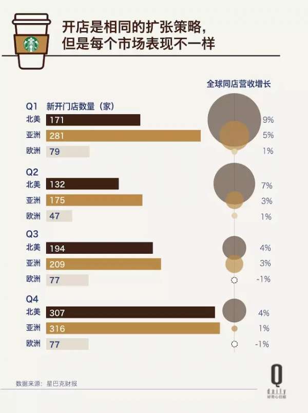 即便是在美国也一样。在前 3 个季度的 171 家、132 家、194 家之后,第四季度的星巴克在美国市场的新开门店数为 307 家几乎是第一二季度的总和,考虑到第四季度资本市场的小幅度回升反应,开店还是有效的。