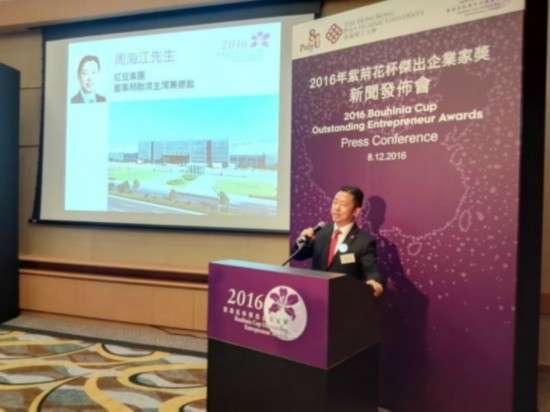 12月8日,在香港会议展览中心举行的第九届“紫荆花杯杰出企业家奖”颁奖典礼上,作为内地优秀的民营企业代表,全国工商联副主席、红豆集团总裁周海江,继其父亲周耀庭荣膺首届紫荆花杯杰出企业家奖后,再次摘得此项荣誉。