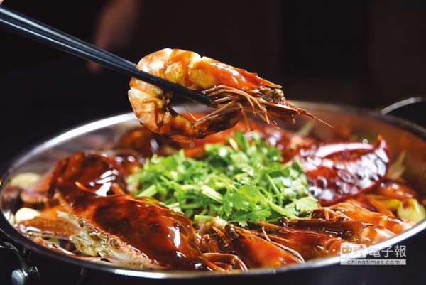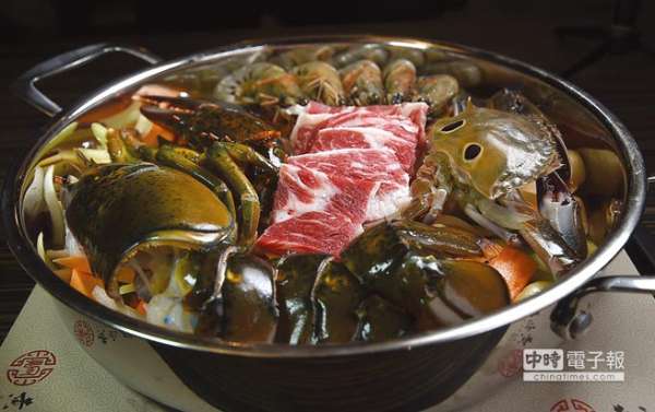 〈豪华拼盘〉焖锅内的食材很丰富,内有梭子蟹、斑节虾、半尾波士顿龙虾,以及厚切安格斯牛小排肉片。图/姚舜