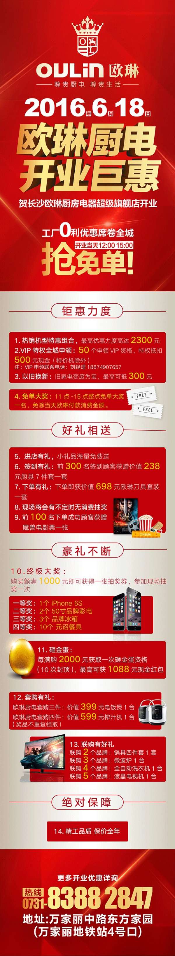 为感恩回馈新老消费者,在长沙厨电旗舰店店隆重开业之际,OULIN欧琳联合建行、生活家地板、伊奈卫浴、生活家衣柜、圣?凡尔赛陶瓷、生活家木门、法迪奥橱柜多个品牌共同发起,活动礼品发放形式以欧琳主办方为主。