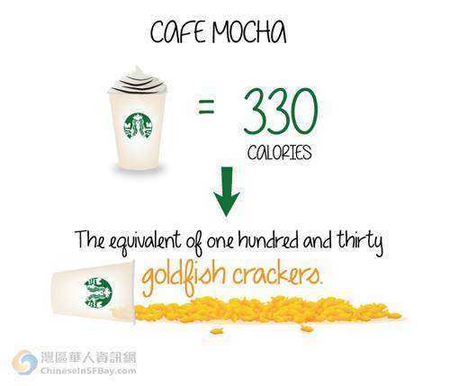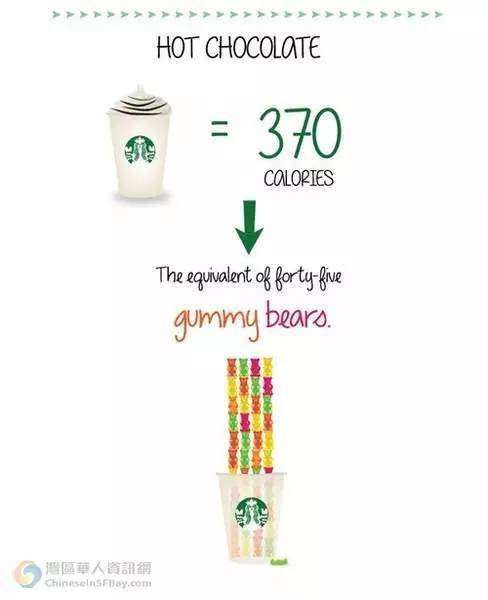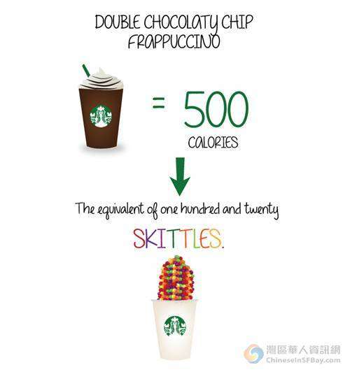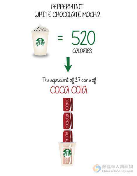 童鞋们都很爱喝星巴克,但是却很少关注它超高的卡路里含量。一个非常有才华的咖啡专家想到了用对比的方式去量化星巴克的卡路里指数。