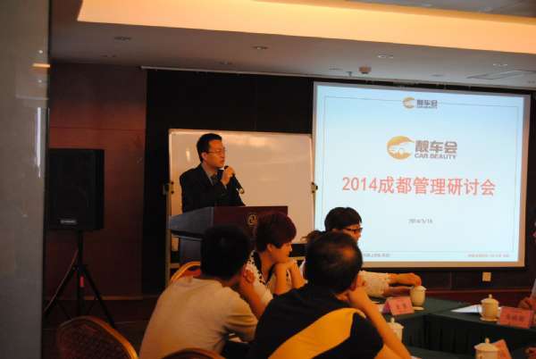 靓车会店面服务管理提升研讨会于2014年5月18日在成都波菲尔特酒店召开并在当天圆满落幕。会议由靓车会市场部赵经理主持,参会人员共计46人,其中加盟商11组、潜在客户8组。