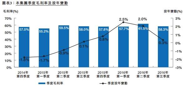 增加0.3个百分点至58.3%,主要由于人民币计值的原材料供应成本减少及产品组合变动。