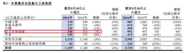 具体来看其第三季度业绩,智通财经发现,除了亚太地区的营业额上升7%外,其他地区的营业额都呈现跌势。其中中国大陆和中东地区的颓势最为严重,大陆营业额下降10%至2.7亿港元,中东地区下降9%至1.59亿港元。而亚太区的增长主要受泰国地区的强劲增长所带动。