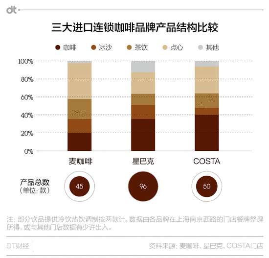 根据DT君在麦咖啡、星巴克和COSTA三个洋品牌(上岛咖啡和两岸咖啡包含餐饮服务,此处不纳入比较)门店收集的餐牌信息,麦咖啡的产品数是三家中最少的——45款,还不到星爸爸(96款,不包括咖啡豆)的一半。