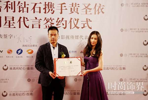 钻石携手黄圣依明星代言续约仪式在广州举行,当天,黄圣依小姐一袭紫色长裙佩戴金嘉利钻石首饰惊艳亮相续约仪式,美艳迷人!金嘉利钻石董事长吴德荣先生以及金嘉利钻石高层领导齐聚广州出席仪式。黄圣依在签约仪式中做了简单发言并表达了诚挚祝福!