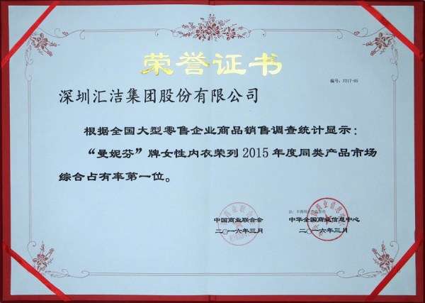 ”品牌女性内衣荣列2015年度同类产品市场综合占有率第一位,并且连续14年(2002-2015)荣列同类产品市场销售第一位。同时,“