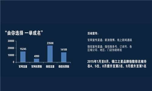 风尚其实是给客户打造个性化的不同的形式,不同的可能是房间、大堂的形式,一样的是锦江之星的服务品质。在这之前,其实这个名字并不是我们公司定的,是通过我们的消费者来定的。所以我们在推出之前做了一次,名字由我们的客人去互动,去选择他们喜欢的名字。通过网络、微信跟客人互动以后,产生了刚才看到的锦江之星品尚、风尚的系列品牌。官网的流量、微信的流量都是非常活跃的。同时通过这些手段,在2015年1月份到8月份品牌一直维持在第五位,8月份推出这项活动以后,提升到第二位。9月份提升到第一位。怎么在互联网上跟客户沟通,听取客户的意见,跟客户产生共鸣这个方式是很好的,同时也给品牌带来更好的关注度。