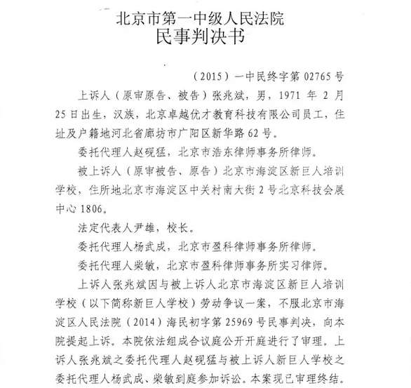 巨人教育集体出走案终审判决:张兆斌等十名老师败诉,需赔百万元