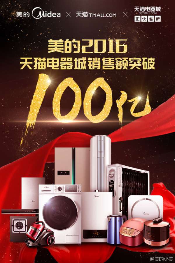 而2016年12月28日,美的集团发布电商年度“成绩单”——2016全年在天猫单渠道销售额突破100亿,成为家电行业史上一个重要里程碑,也是天猫首个年销售额破百亿的家电品牌。美的2016上半年线上销售总量超100亿,而天猫年度单渠道已破百亿,据推测天猫在已在所有电商渠道中位列第一。