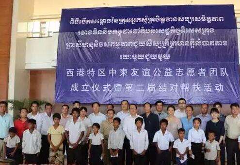 今年3月30日,西港特区中柬友谊公益志愿者团队成立仪式暨第二届爱心结对帮扶活动在西港特区顺利举行。西港特区中柬友谊公益志愿者团队的建立,有效壮大了志愿者队伍,拉动更多的人投身公益事业中,扩大了公益影响力。去年5月,西港特区公司在毗邻特区的默德朗乡小学举办了爱心结对帮扶活动,西港特区公司13位员工与默德朗乡小学13名贫困学生结成“一对一”帮扶对子,资助这些学生直至小学毕业。今年,这些员工在去年的基础上,继续予以资助。成立仪式上,员工代表们还向这些贫困学生送上了爱心文具。
