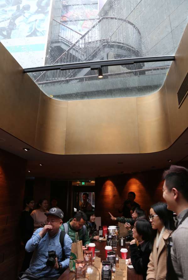 河流的上游是热闹的集市,而Barista Craft Room就设立在星巴克武汉天地臻选店的最深处。深褐色玻璃幕墙上缓缓播放着与星巴克和咖啡文化有关的动态风景,玻璃屋顶则让它变成了“看得见风景的房间”,四季变换与万千气象与室内浪漫相融。