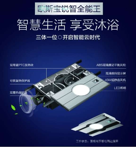 三款智能三合一产品,智沐暖风宝、智炫暖浴王、锐智全能王,集照明、换气、风暖一体化设计,智能检测温度,强效制热模式,超静音滚珠轴承电机,超大LED照明光源,集成照明,环保更节能;其中“锐智全能王”以科技感十足的中东科技大楼为设计理念,当智能一体化运作时,智能面板则会自动向两侧滑开,智能显示当前照明、换气、取暖等工作状态,超先进的智能控制屏,无需任何接线处理,高档金属拉丝等先进环保面板,科技感爆棚。
