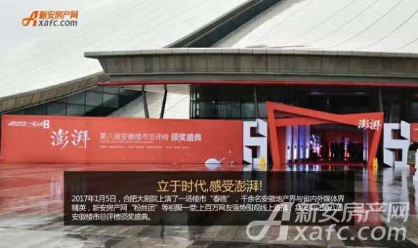 持续近两个月,引千万人次关注,由安徽省房地产协会指导,新安房产网与合肥学院房地产研究所联合主办的,本年度最受瞩目的“澎湃”2016—第八届安徽楼市总评榜颁奖盛典于2017年1月5日在合肥大剧院华丽启幕!