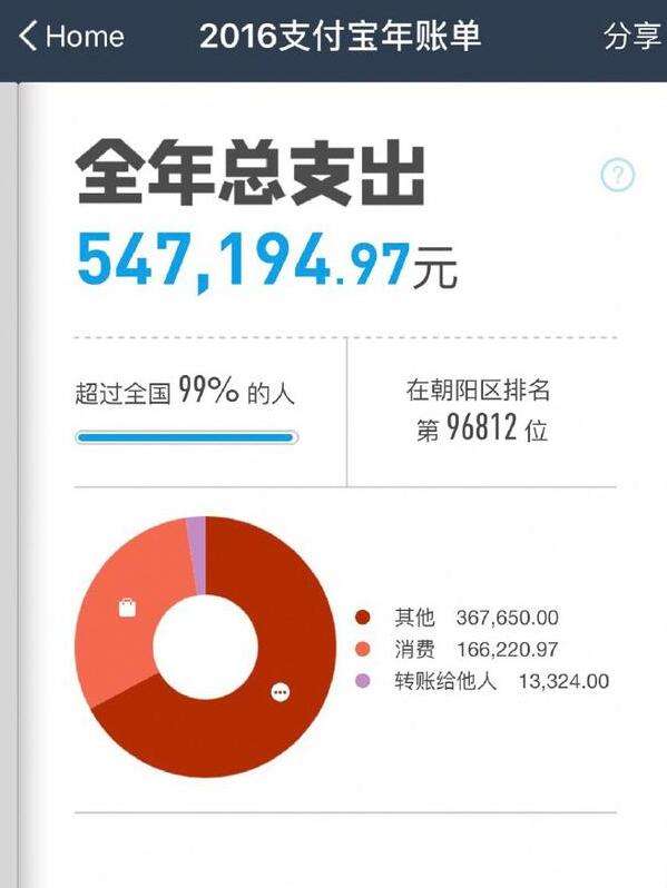 搜狐娱乐讯 1月8日,高晓松在微博晒出个人年账单,账单显示在过去一年总花出去54万,其中消费一栏是16万多,在朝阳区排9万多名。高晓松写道:“一个阿里人,到哪都坚持用支付宝,上至肯德基下至烤白薯都支付宝。一年下来发现自己花的没多少,账单里2/3的钱都用来给阿里员工发了红包。这是一种怎样的精神?是一种毫不利己专门利人的精神!这是一纯粹的人!一脱离了低级趣味的人!一有益于人民币的人!TMD朝阳群众太有钱了,差点被甩出十万名以外。”