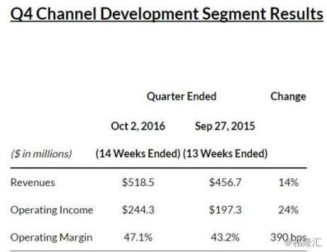 同时,为了符合中国本土消费情况,星巴克看在拓展销售渠道方面,取得了很大的进展(就比如我们现在在超市和小杂货铺都可以买到星巴克的瓶装咖啡),这也使营运毛利取得了不错的提升。