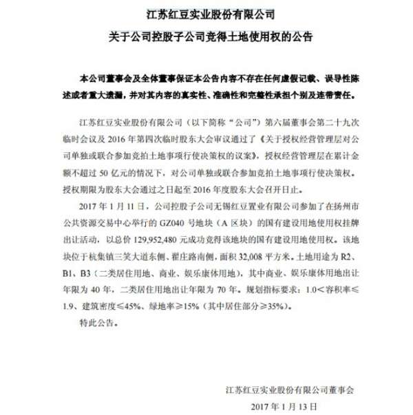2017年1月11日,公司控股子公司无锡红豆置业有限公司在参加扬州市公共资源交易中心举行的 GZ040 号地块(A 区块)的国有建设用地使用权挂牌出让活动中,以总价129,952,480元竞得该地块的国有建设用地使用权。该地块位于杭集镇三笑大道东侧、翟庄路南侧,面积32,008 平方米。土地用途将为R2、B1、B3(二类居住用地、商业、娱乐康体用地)。