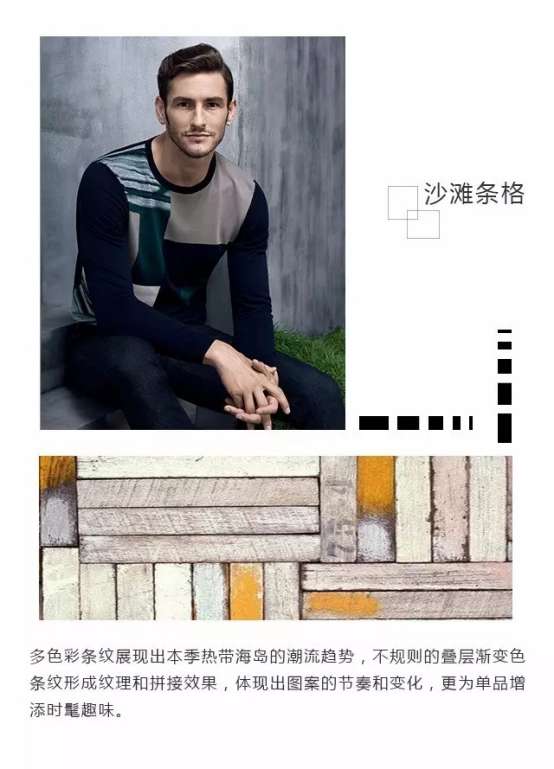 绿色生活方式的倡导,促使2017春夏商务休闲男装的花型流行更加趋于自然,也推动了运动风和现代感发展成为简约潮流,在这一季流行的花型元素中,随处能捕捉到它们的存在。