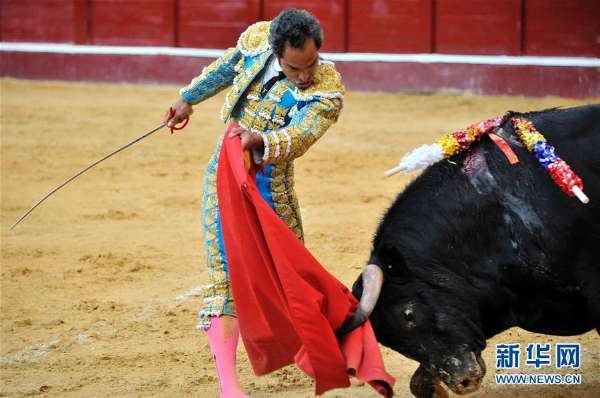 1月22日,在哥伦比亚波哥大,哥伦比亚斗牛士玻利瓦尔进行斗牛表演。哥伦比亚斗牛节在波哥大圣玛丽亚斗牛场举行。 新华社/西霸