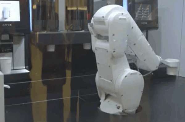 预定之后,Cafe X发送一则消息到移动设备,上面有4位验证码,你在机器人贩售机中输入就可以了。此时机器臂(三菱制造的)从8个加热站上抓取1个杯子,将它放在1个小架子上,这种架子与贩售机看到的架子差不多,然后你就可以取走咖啡了。整个过程耗费的时间不到1分钟。