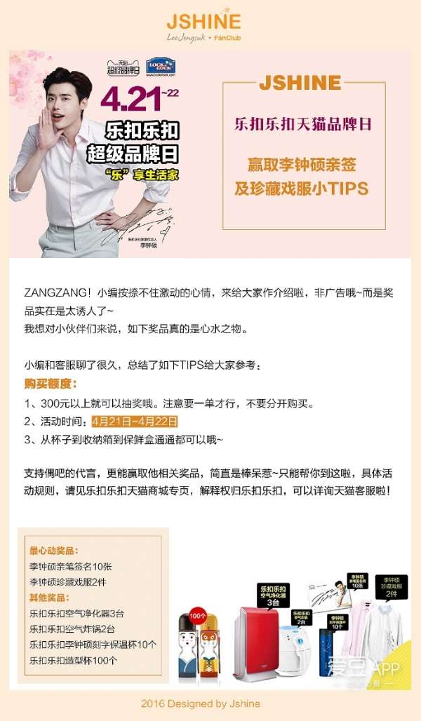 爱豆新闻讯 李钟硕代言的品牌乐扣乐扣于4月21日-22日推出“乐扣乐扣天猫品牌日”活动,