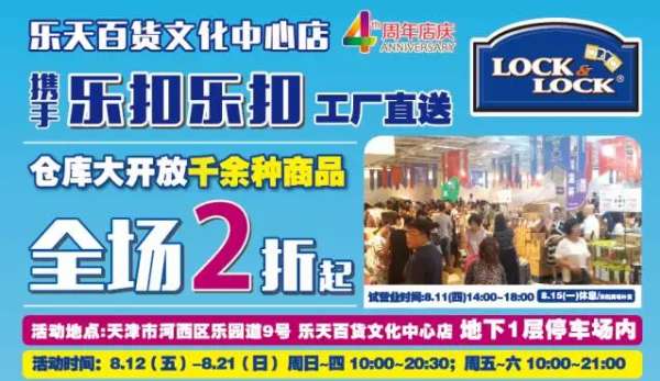 新华网天津 (张博)8月12日,正值乐天百货文化中心店四周年店庆之际,特携手乐扣乐扣举行专场特卖会,千余种商品工厂直送,此次特卖相较于去年的抢购,增添的更多产品,且折扣力度更大。