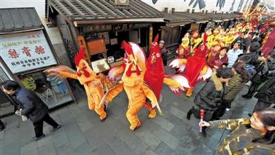 杭州河坊街上表演队伍向游客民拜年送福龙巍摄