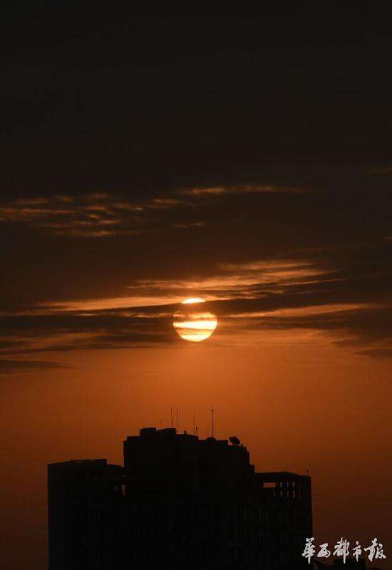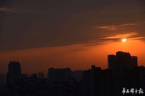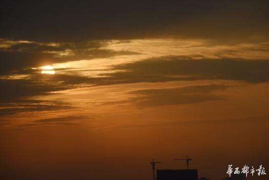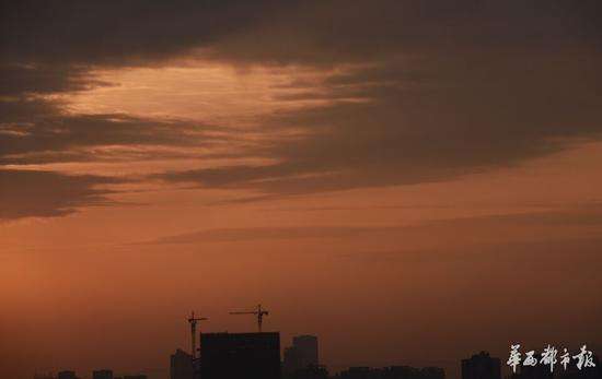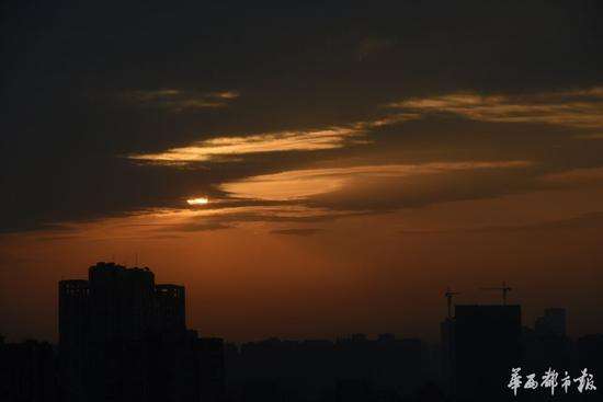 今早,一轮红日从成都东方冉冉升起,天空出现了彩霞满天,这是成都近期来难得看见的朝霞。