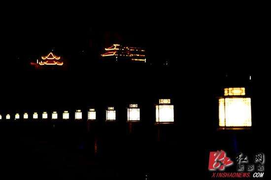 赛双清公园、各广场、小区、院落张灯结彩,有的繁星点点,玲珑别致;有的流光溢彩、绚丽夺目,夜幕下俨然成了一幅幅精致的艺术作品。正是:大美湖南之心,幸福和谐生活。