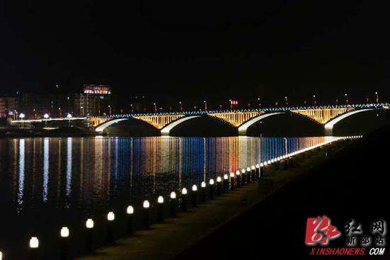 夜幕降临,各种彩灯如鲜花纷纷绽放,亮化灯景成为新邵县一道道靓丽的风景线。资江河畔,五颜六色的彩灯在河水的映照下闪闪发光。