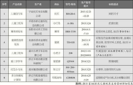 看着商场里琳琅满目的儿童玩具,不得不感叹现在的小朋友太幸福了。然而,幸福中也存在着隐患。日前,记者从浙江省质监局了解到,优贝儿童自行车、丹妮奇特多功能翻板计算架、婴爱喜婴儿学步车等16个批次的儿童玩具存在缺陷,宁波优贝车业有限公司等14家企业将召回这些问题玩具。