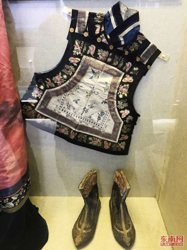 清代绣花蝶有领坎肩(上)与清代长筒绣花靴(下)