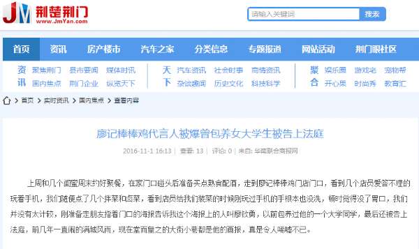 海报上说廖钦勇是廖记棒棒鸡的创始人之一,也是企业的相关负责人,前几年把在公司上班的一个女大学生骗到茶楼喝茶,晚饭后将女大学生灌醉带到宾馆强行发生了性关系,而且女大学生已经有了男朋友。事发后怕女大学生报警又哄骗女大学生与其谈恋爱结婚,在女大学生怀孕后又以事业为由要求女大学生堕胎,后来女大学生发现廖钦勇已经结婚并有子女,一气之下把廖钦勇告上法庭要求索赔40万(搜索当事人姓名就可以看到当时各大网站报道)。这种人的行为可谓令人发指。现如今他通过各种媒体的粉饰来洗白自己过去的罪行。我不知道广告法是怎么样的规定的,但是我觉得从社会道德认知上,如果这个品牌是这样的人创立的,人如品牌,相信这个品牌走到今天也是存在很多的猫腻的。虽然当初这件事最终不了了之,但是管可窥豹,从一个企业的创始人行为可以看出无论如何粉饰,这种人带领的品牌的都无法让人信服,事实是无法被掩盖的,不然何来的天理可言。做人做企业都讲求良心二字,没有了良心那早晚也无法在社会立足。同时这样的企业深层次来说也存在巨大的风险。因为现在不是什么事都可以用钱来摆平的,如果还抱着这种心态,那未来可想而知。