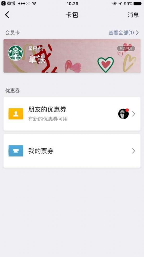 收到礼品与祝福,可以通过微信“我-卡包”入口查看并使用。如果所在位置周围有星巴克门店,礼品卡还会在卡包里自动置顶方便使用。
