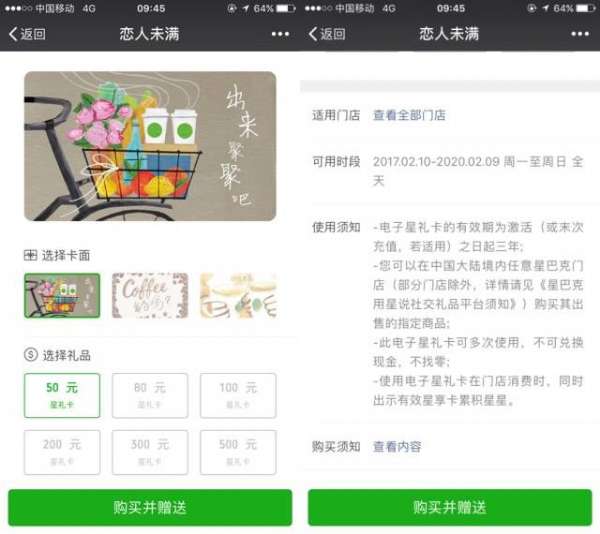 你可以在线购买单杯咖啡兑换卡或“星礼卡”(储值卡)赠送给微信朋友,并在赠送页面用文字、图片、视频留下你对TA的专属祝福。