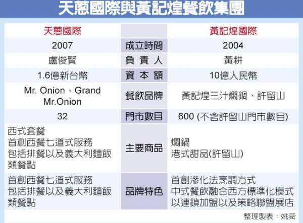 为扩充集团营动能,以「Mr.Onion」品牌立足西式排餐市场的天葱国际集团,携手北京黄记煌餐饮集团在台成立合资公司,并引进有「中国焖锅第一家」之称的「黄记煌三汁焖锅」,正式跨足中餐市场。天葱国际董事长卢俊贤与黄记煌集团董事长黄耕将于今(8)日签订合作意向书,正式向投审会提出申请。