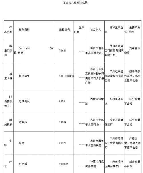 商品色牢度项目不合格。维尼、卓维乐、可丽酷奇、班吉鹿等标称品牌商品纤维含量不合格。