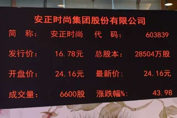 安正时尚开盘后,股价大涨43.98%至每股24.16元,目前市值约为68.87亿元。进入2016国内上市