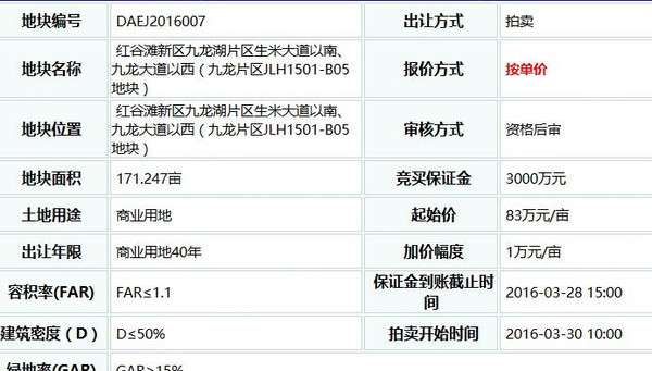 杉杉奥特莱斯位于九龙湖生米大道以南、九龙大道以西,面积共171亩。2016年3月30日,南昌杉杉奥特莱斯购物广场有限公司以底价83万元/亩拿下该地块,总价约为1.42亿元,合计楼面价仅1132元/㎡。