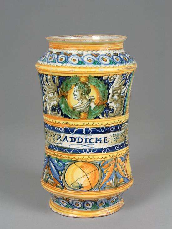药罐 杜兰特堡的西蒙?达?科隆内洛工坊 16世纪下半叶 锡釉陶 高29.7厘米、肩径16.5厘米