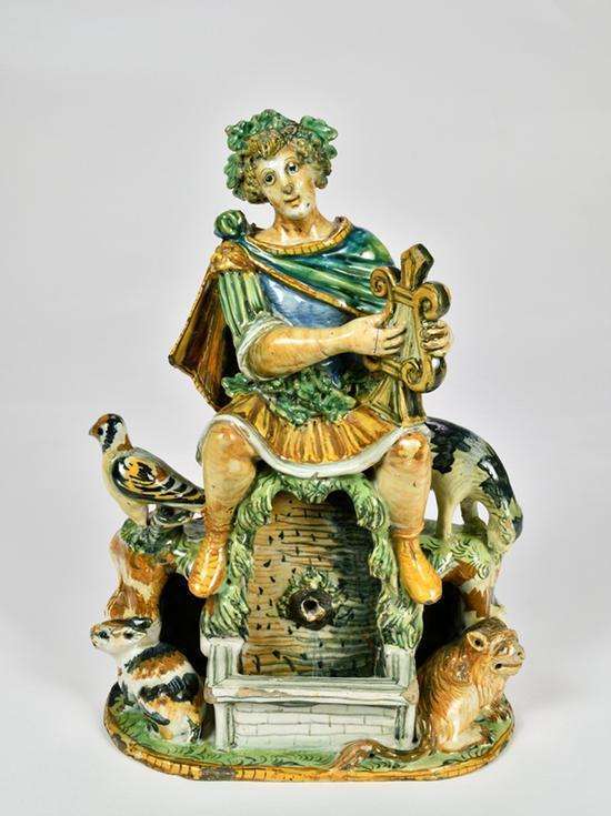 人像水罐 乌尔比诺的潘塔纳兹工坊 16世纪末期 锡釉陶 高34.5厘米、长23.5厘米、宽14.7厘米