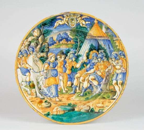 亚历山大大帝前的达里奥家族纹章盘 焦万?巴蒂斯塔?达列?怕列(现有资料1560年~1573年) 维罗纳 1563年1月15日 锡釉陶 高5.5cm、直径39cm