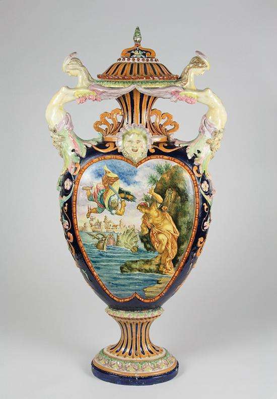 绘有“珀尔修斯和安德洛墨达”的双耳瓶 法恩扎、米纳尔迪兄弟工坊 19世纪末 锡釉陶 通高102厘米、通宽50.5厘米、腹径21厘米